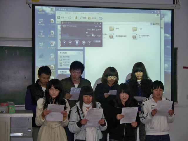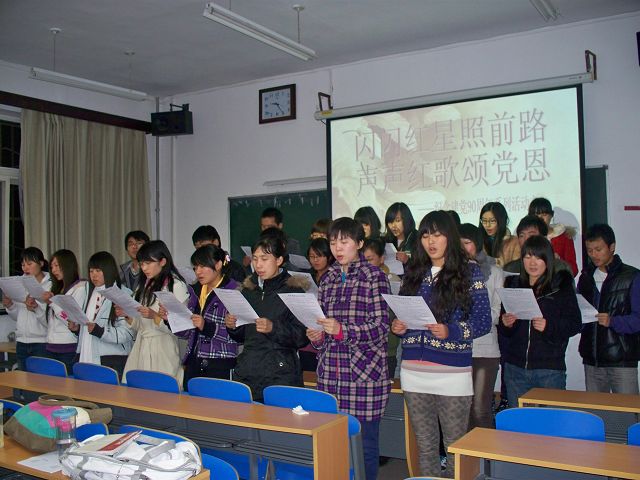 2011年是我们伟大的中国共产党90岁的生日,为纪念建党90周年,特开展此项系列活动。本次为首次活动。首先,由崔高峰同学讲解有关《走进新时代》和《学习雷锋好榜样》的相关知识背景。《走进新时代》是一首红色歌曲,整首歌曲充满了爱国主义精神,旋律充满正气,歌词健康向上。歌颂了我们伟大的党和人民。亲切深情地反映了对祖国、对人民和对一切美好事物的热爱!《学习雷锋好榜样》,这首歌以其特有的旋律和激情,感染着一代又一代人。然后欣赏了这两首歌曲,熟悉了歌词。紧接着,全体成员和着音乐练习歌曲。在袁金玲同学的领唱下,全体成员合唱《走进新时代》。随后又由张文秋同学和宋杰同学独唱《学习雷锋好榜样》。分组合唱完后,此次活动在全体同学的歌声中圆满结束。