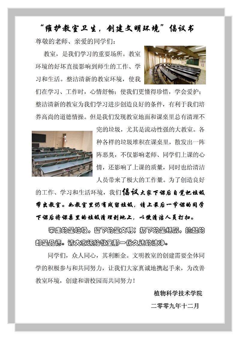 这是太阳成集团tyc7111cc员工会自律部和生活部联合发起的“维护教室卫生,创建文明环境”倡议,2009年12月16日中午,自律部部长、副部长将亲自带部员设计、制作的宣传画幅,在校园、教学楼、教室悬挂粘贴,希望通过醒目、温馨的提示,以实际的行动,影响全校同学携手共建文明校园,为和谐校园贡献力量!