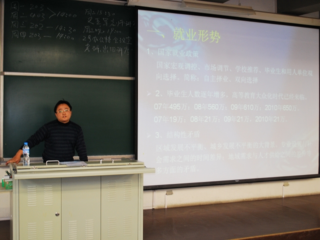 2009年11月16日下午2:00在教B203举行了首场就业指导讲座,讲座特邀员工处就业指导中心的党登峰老师主讲,副经理赵金芳,团总支书记牛奔及2010届全体同学参加了此次就业指导讲座。