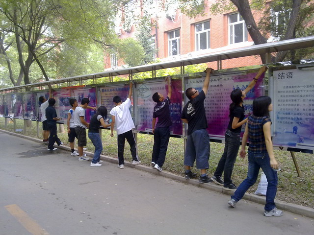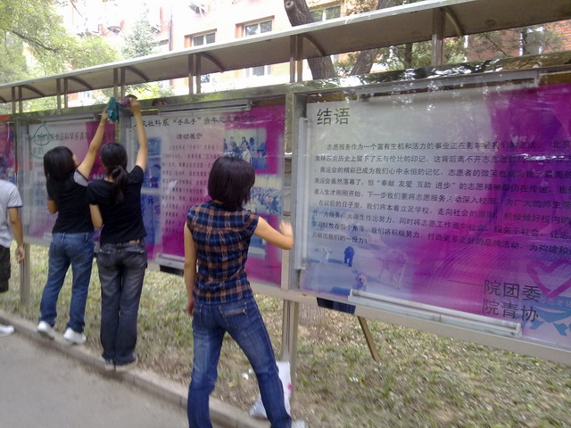 同学们不怕苦、不怕累、不怕脏,在班委的带领下,分工有序、忙而不乱,四十几个布满灰尘和污渍的报刊栏经过一个小时的清洁重现光鲜闪亮的容貌,同学们脸上也洋溢着自豪的笑容。同学们的义务之举得到了院里老师的赞赏。