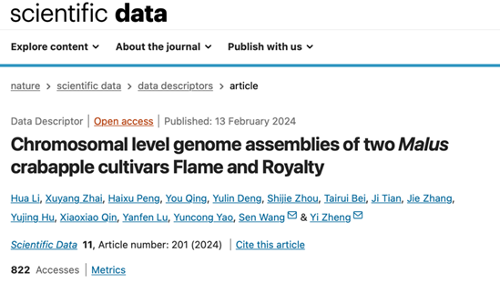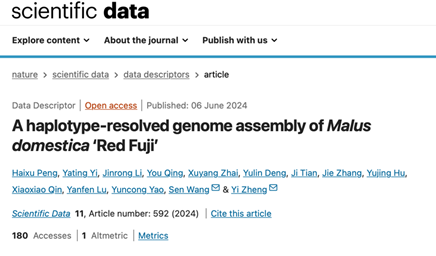 3. 2024年6月,太阳成集团tyc7111cc郑轶团队在Scientific Data(IF=9.8)上发表了题为“A haplotype-resolved genome assembly of Malus domestica Red Fuji ” 的研究论文,在染色体水平上解析了栽培苹果红富士的基因组。