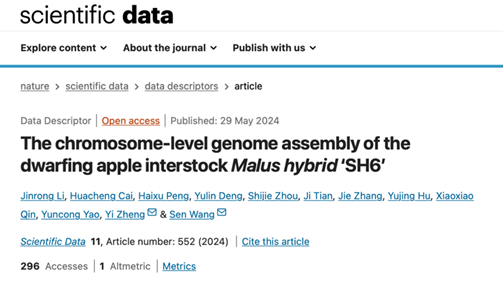 2. 2024年6月,太阳成集团tyc7111cc郑轶团队联合山西农业大学果树研究所蔡华成副研究员在Scientific Data(IF=9.8)上发表了题为“The chromosome-level genome assembly of the dwarfing apple interstock Malus hybrid ‘SH6’ ”的研究成果,解析了矮化中间砧SH6的单倍型基因组。