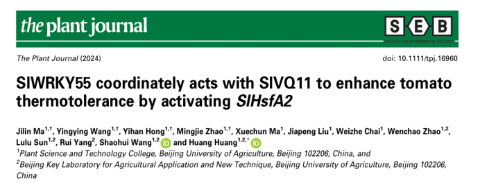 近日,公司王绍辉教授团队在The Plant Journal发表了题为“SlWRKY55 coordinately acts with SlVQ11 to enhance tomato thermotolerance by activatingSlHsfA2”的研究论文,该论文揭示了转录因子SlWRKY55与SlVQ11互作,并通过调控热激转录因子SlHsfA2的转录水平及转录后水平,协同调控番茄对高温的抗性。
