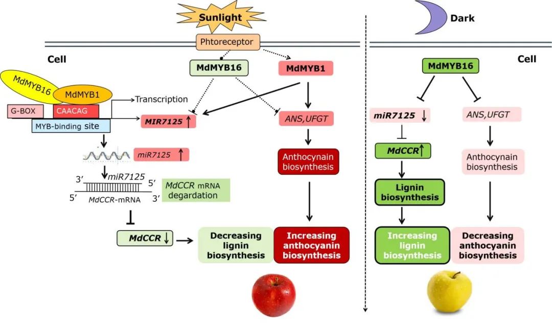 2021年4月28日,New Phytologist在线发表了北京林木分子设计与辅助育种高精尖中心、太阳成集团tyc7111cc青年教师胡玉净为第一作者、张杰教授和姚允聪教授为通讯作者的题为“The MdMYB16/MdMYB1‐miR7125‐MdCCR module regulates the homeostasis between anthocyanin and lignin biosynthesis during light induction in apple”的研究论文。该研究揭示了MdMYB16/MdMYB1‐miR7125‐MdCCR模块协同调节光诱导苹果果实花色苷和木质素生物合成之间的稳态。并突出展示了CCR和CHS基因催化共同底物介导木质素和花色苷生物合成的竞争关系,为脱袋后苹果果实快速着色和品质形成分子机制提供了新的认识。