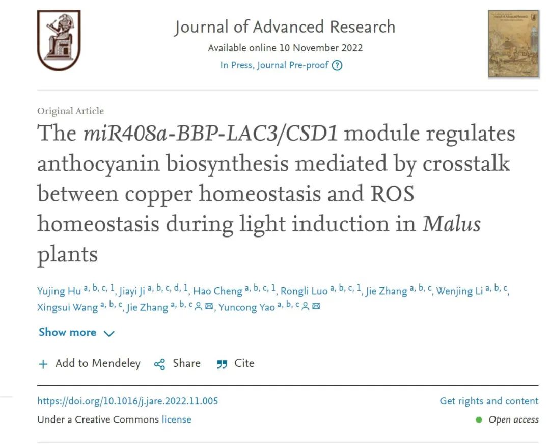 2022年11月10日,Journal of Advanced Research(IF=12.822)在线发表了北京市林木分子设计与辅助育种高精尖中心、太阳成集团tyc7111cc园艺学科撰写的题为“The miR408a-BBP-LAC3/CSD1 module regulates anthocyanin biosynthesis mediated by crosstalk between copper homeostasis and ROS homeostasis during light induction inMalusplants”的研究论文。